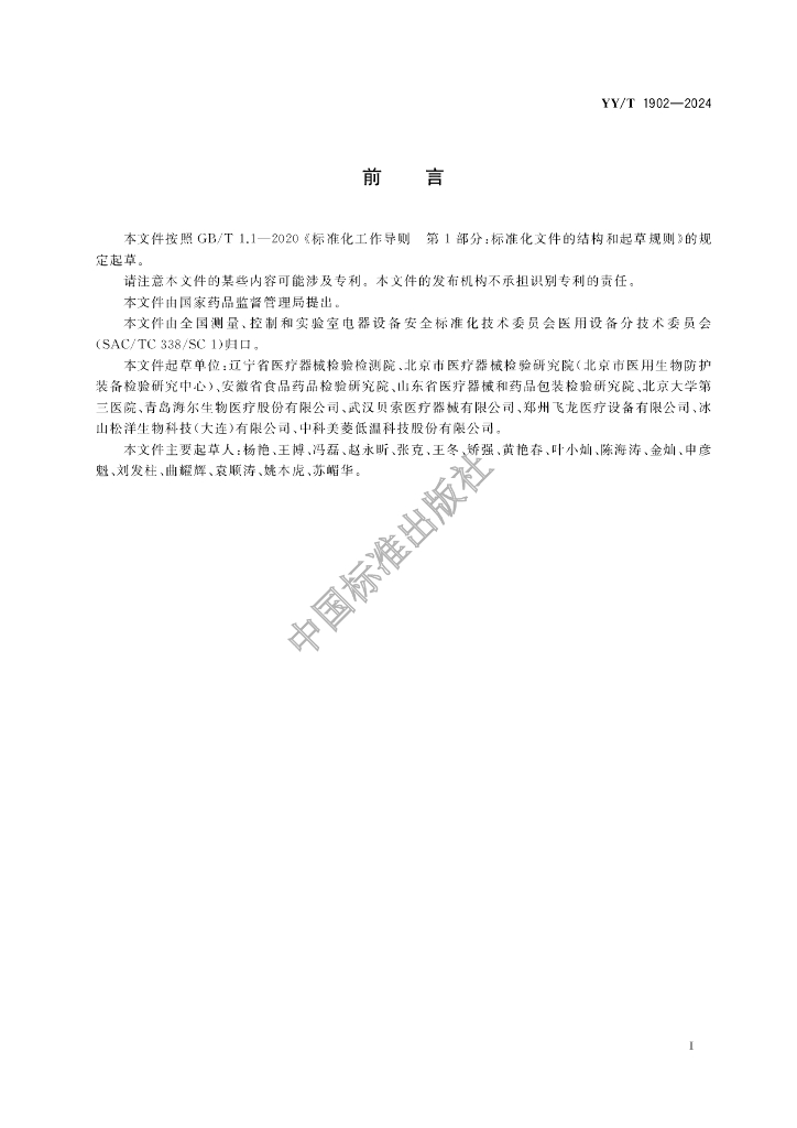 辽宁省医疗器械检验检测院、北京市医疗器械检验研究院(北京市医用生物防护装备检验研究中心)、安徽省食品药品检验研究院、山东省医疗器械和药品包装检验研究院、北京大学第三医院、青岛海尔生物医疗股份有限公司、武汉贝索医疗器械有限公司、郑州飞龙医疗设备有限公司、冰山松洋生物科技(大连)有限公司、中科美菱低温科技股份有限公司