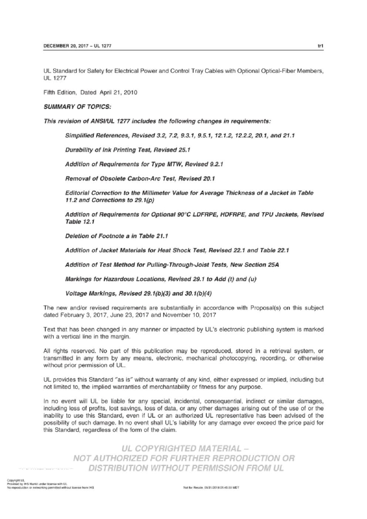UL 1277-2017 具有可选光纤构件的安全电力和控制塔板电缆的UL标准