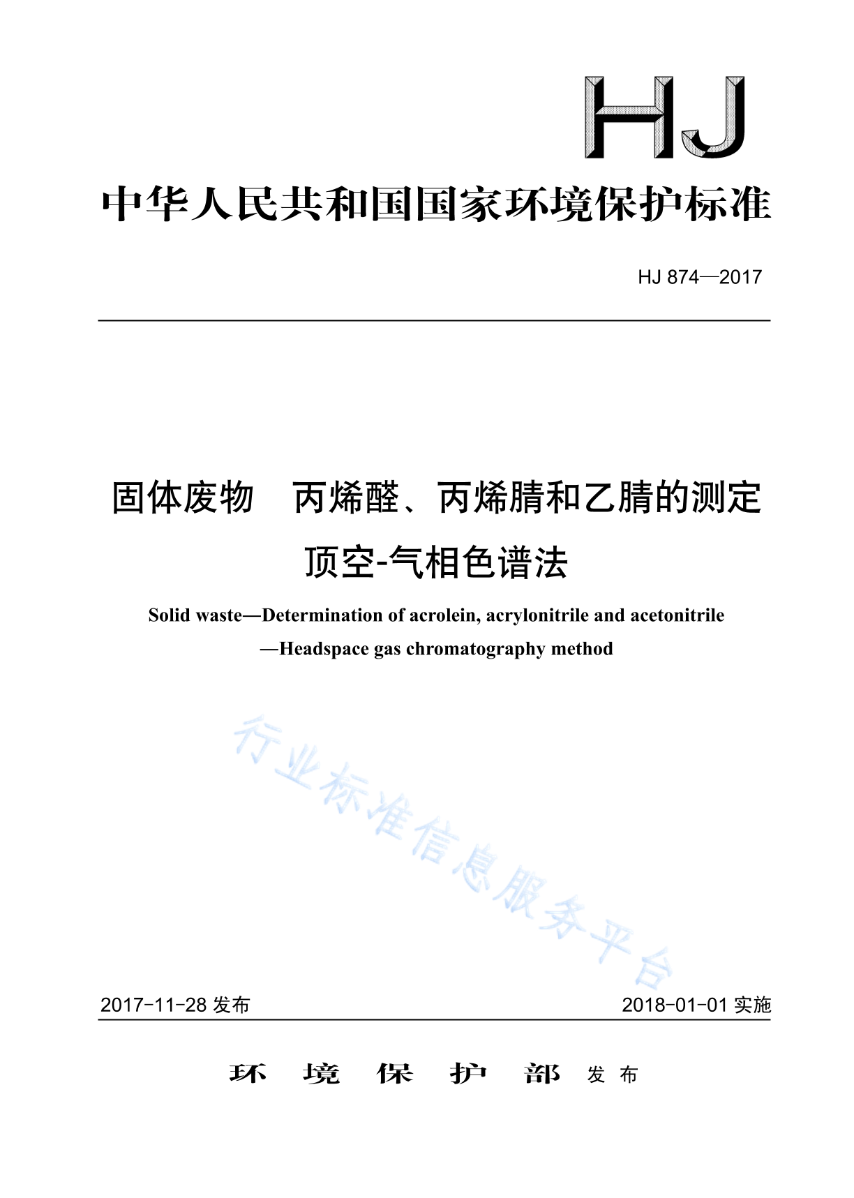HJ 874-2017 固体废物 丙烯醛、丙烯腈、乙腈的测定 顶空-气相色谱法