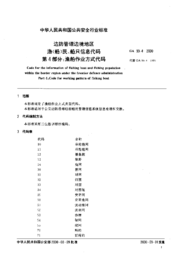GA 99.4-2000 边防管理边境地区 渔(船)民、船只信息代码 第4部分 渔船作业方式代码