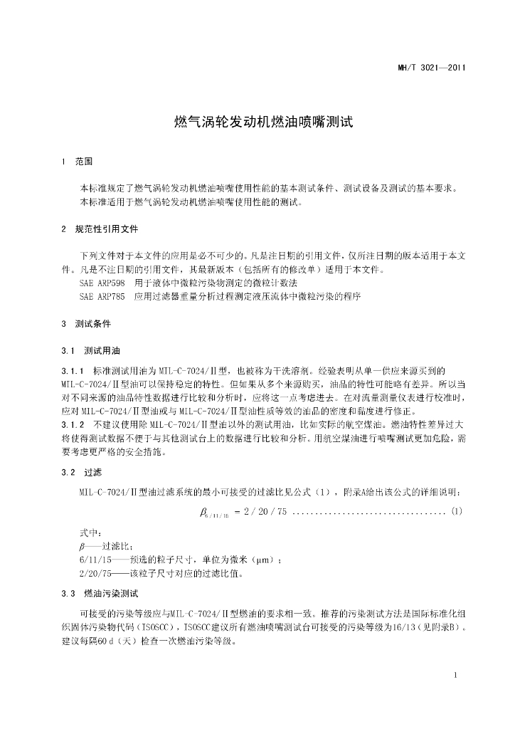 MH/T 3021-2011 燃气涡轮发动机燃油喷嘴测试