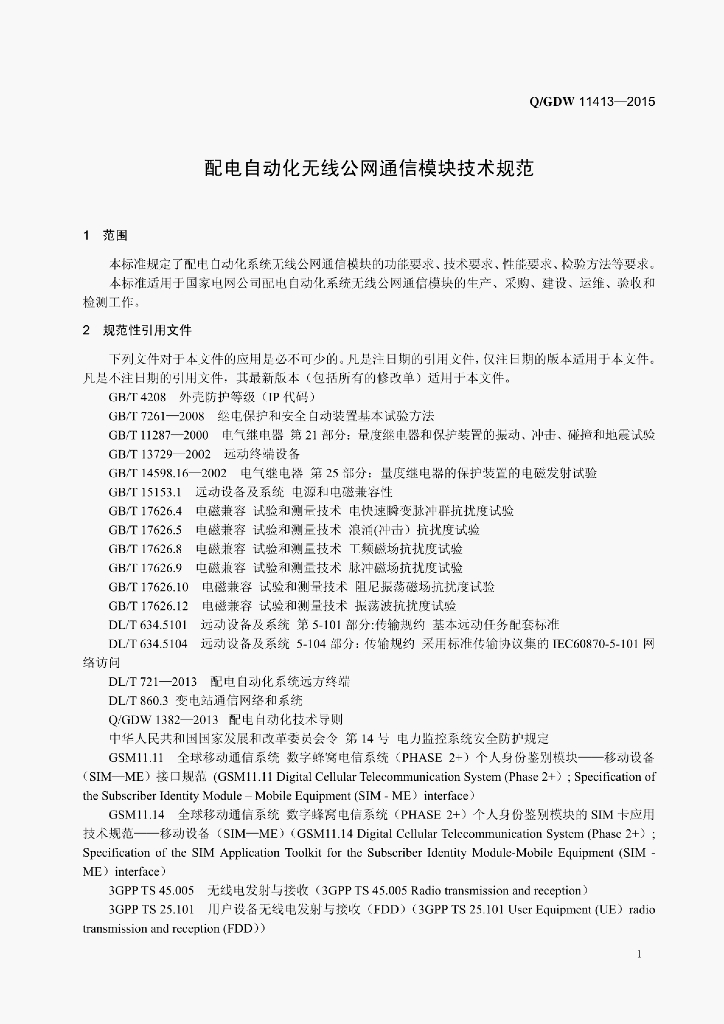 Q/GDW 11413-2015 配电自动化无线公网通信模块技术规范