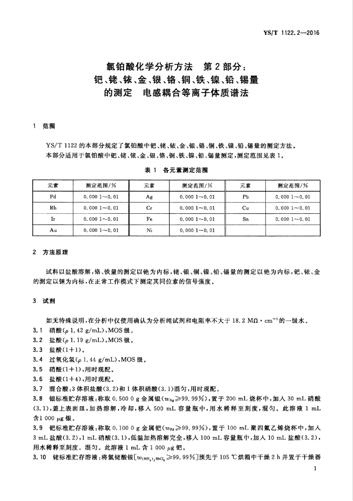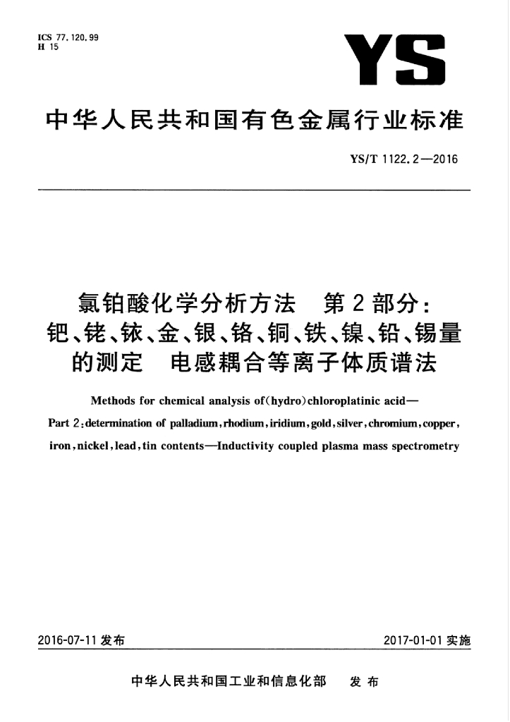 YS/T 1122.2-2016 氯铂酸化学分析方法 第2部分:钯、铑、铱、金、银、铬、铜、铁、镍、铅、锡量的测定 电感耦合等离子体质谱法