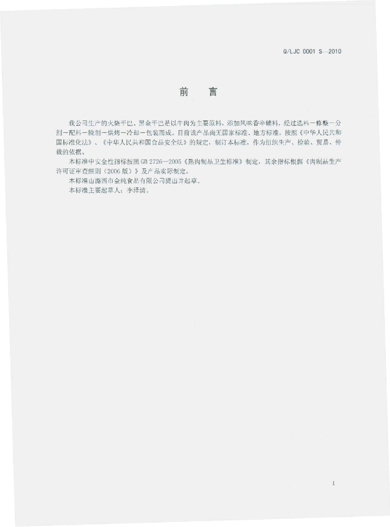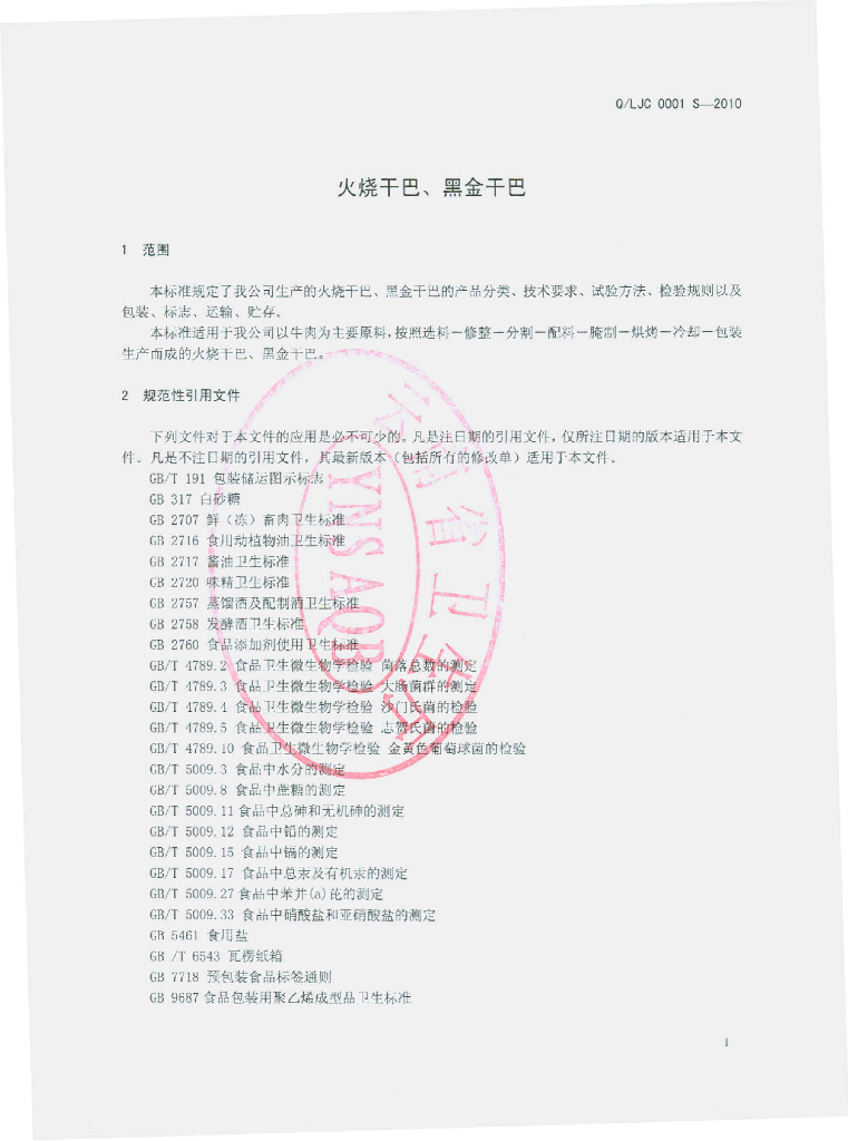 Q/LJC 0001S-2010 火烧干巴、黑金干巴