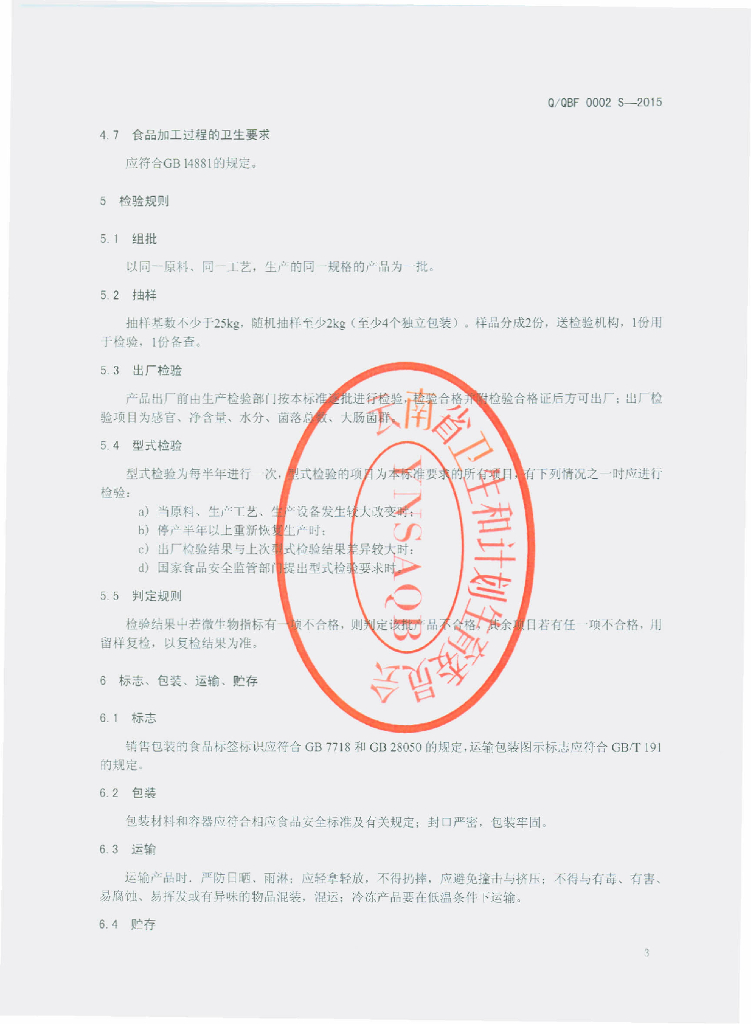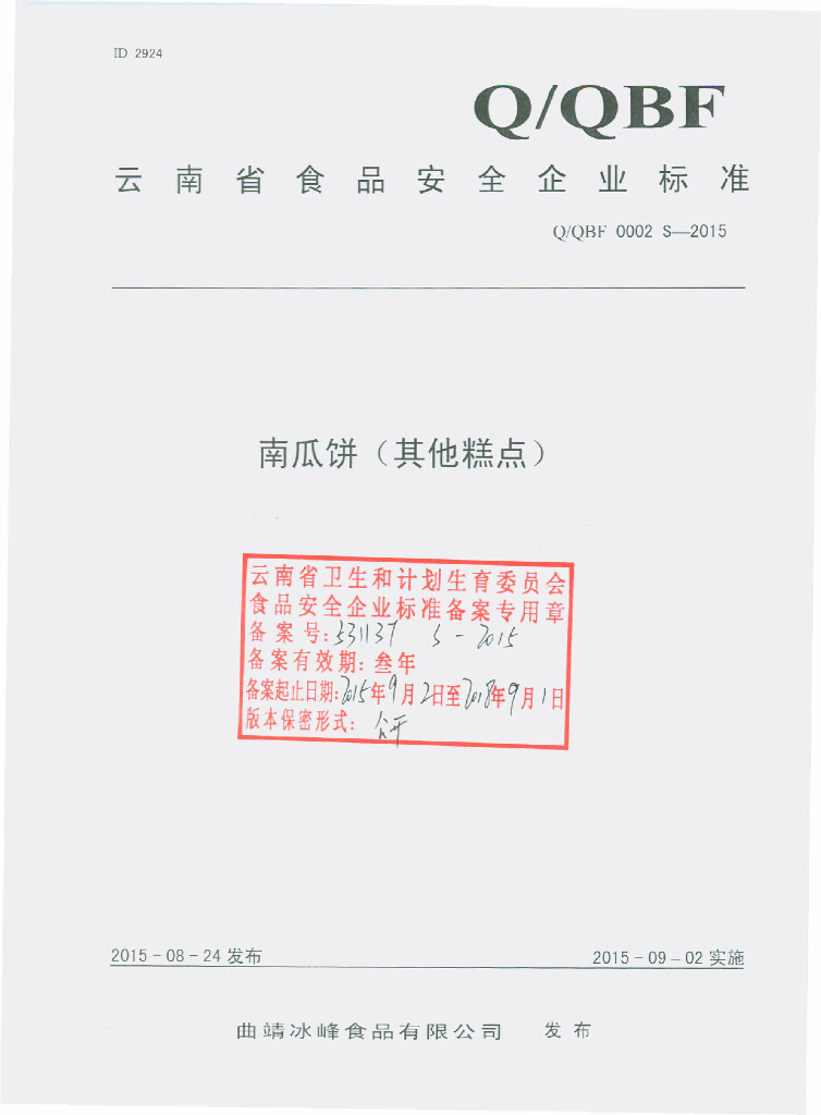 Q/QBF 0002S-2015 曲靖冰峰食品有限公司 南瓜饼(其他糕点)