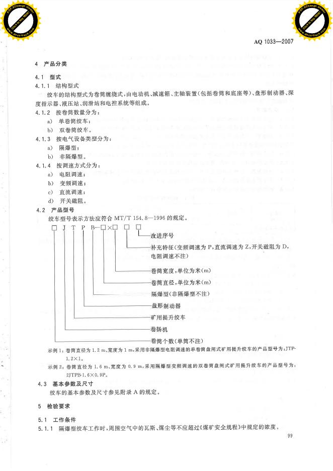 AQ 1033-2007 煤矿用JTP型提升绞车安全检验规范