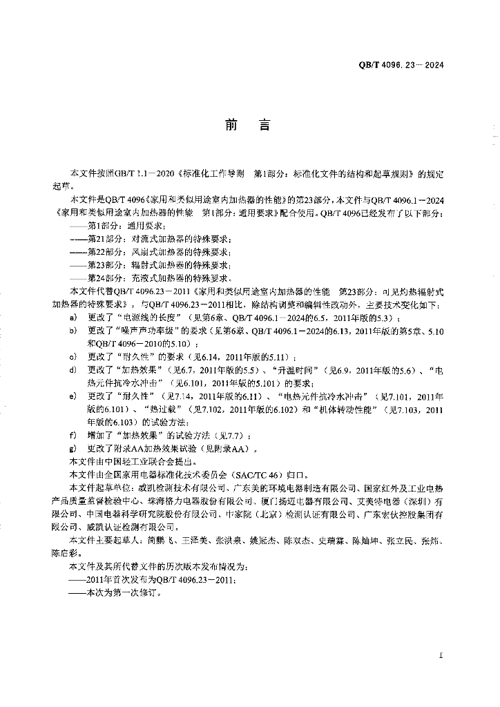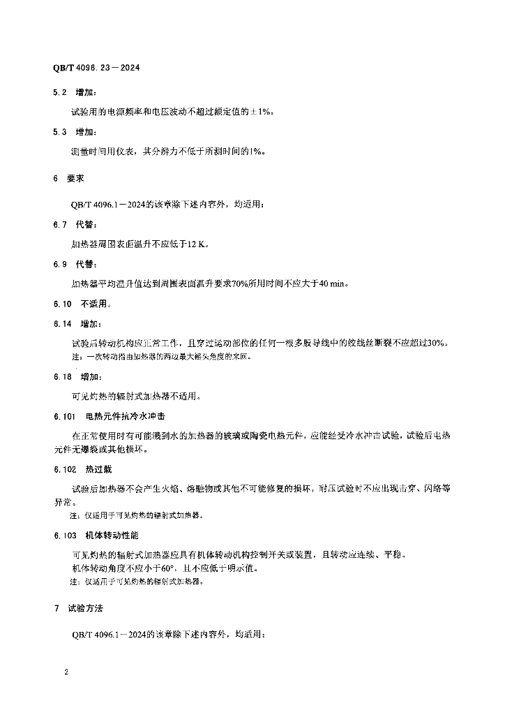 QB/T 4096.23-2024 家用和类似用途室内加热器的性能 第23部分:辐射式加热器的特殊要求