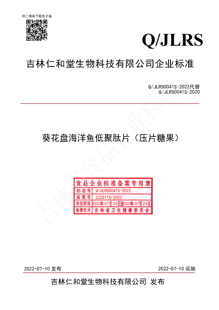 Q/JLRS 0041S-2022 葵花盘海洋鱼低聚肽片(压片糖果)