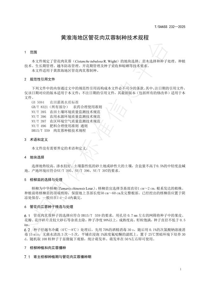 T/SAASS 232-2025 黄淮海地区管花肉苁蓉制种技术规程