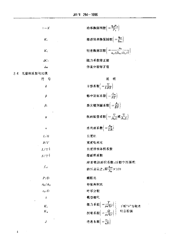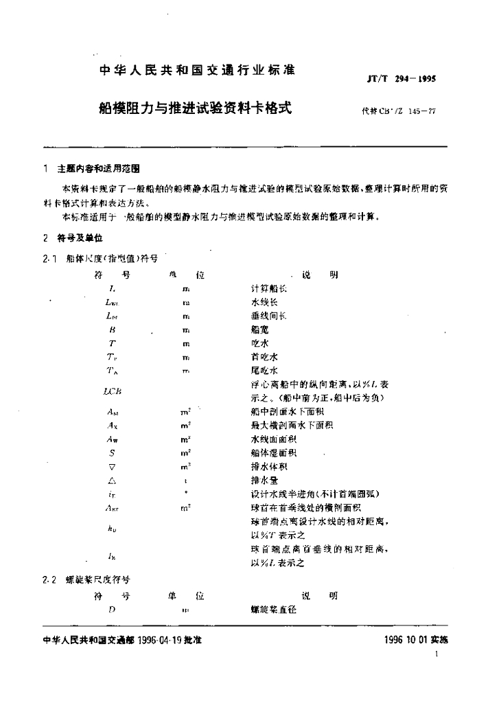 JT/T 294-1995 船模阻力与推进试验资料卡格式