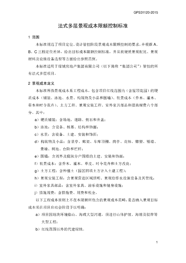 GPS 31120-2015 绿城集团法式多层景观成本限额控制标准