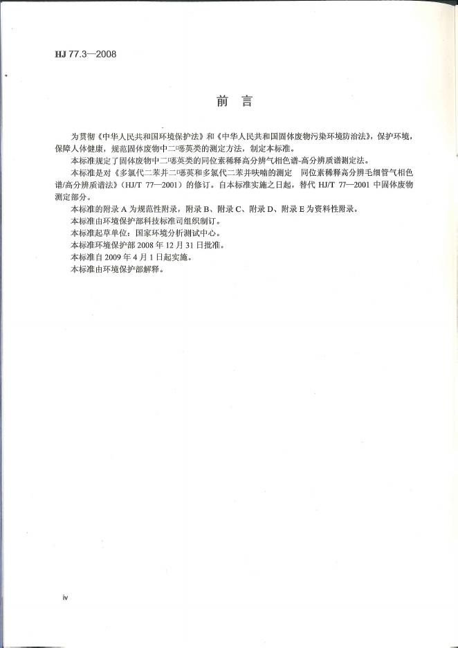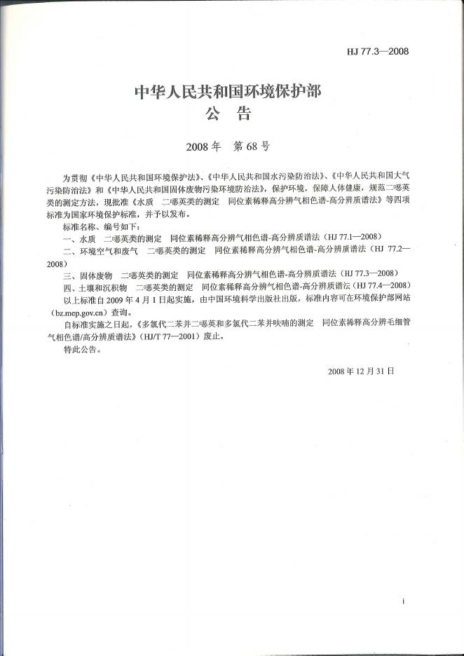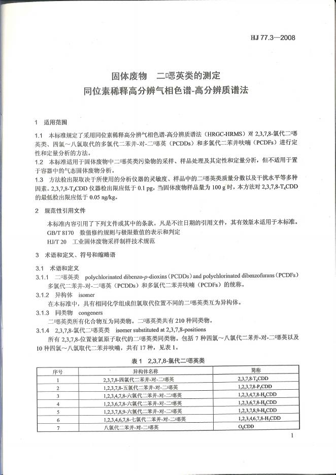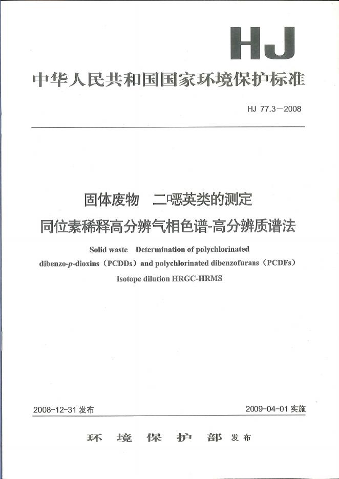 HJ 77.3-2008 固体废物 二噁英类的测定 同位素稀释高分辨气相色谱-高分辨质谱法