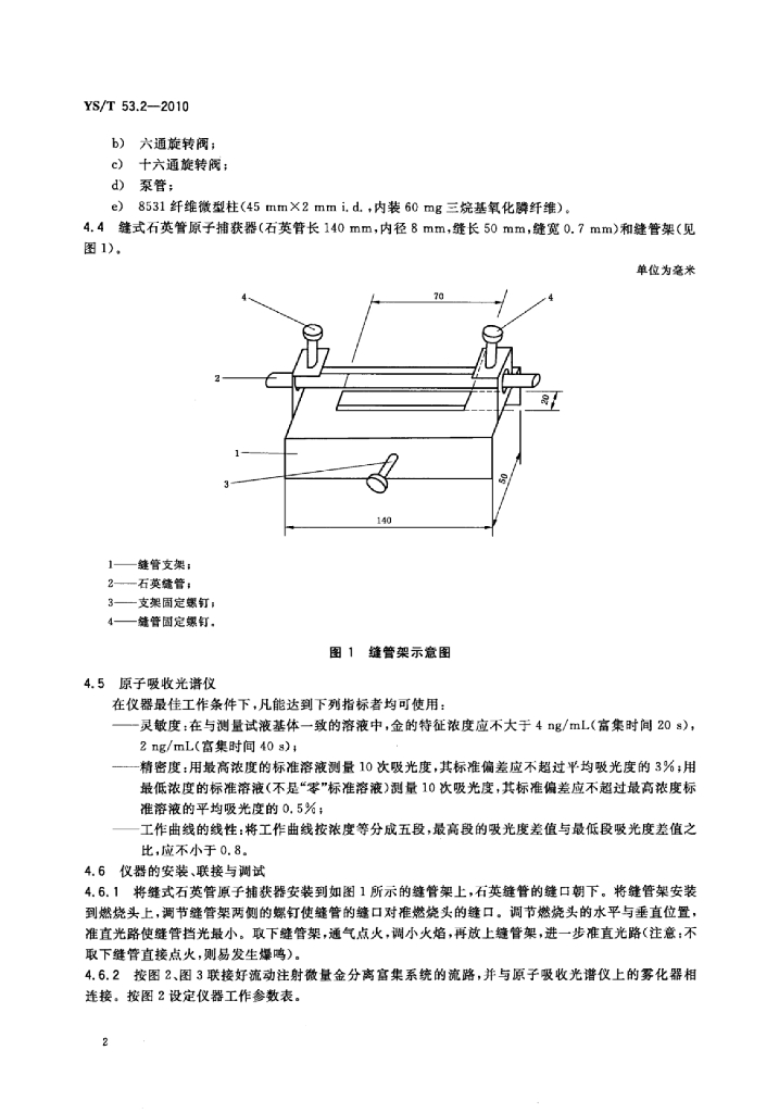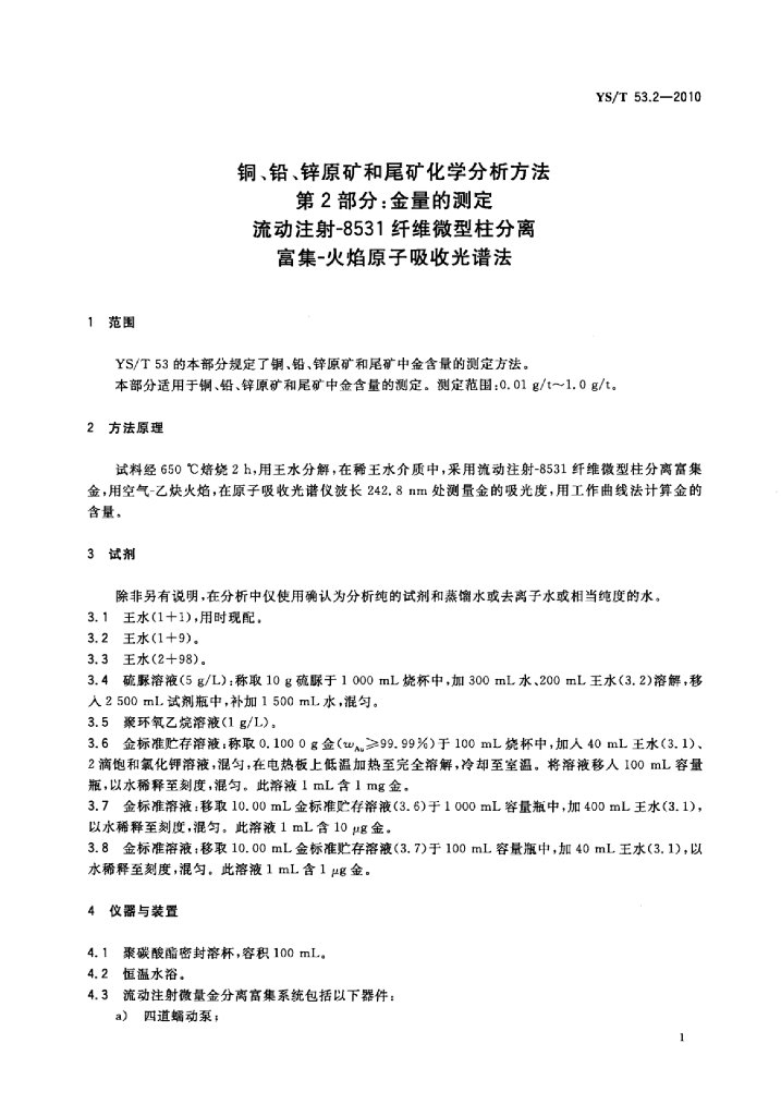 YS/T 53.2-2010 铜、铅、锌原矿和尾矿化学分析方法 第2部分:金量的测定流动注射-8531纤维微型柱分离富集-火焰原子吸收光谱法