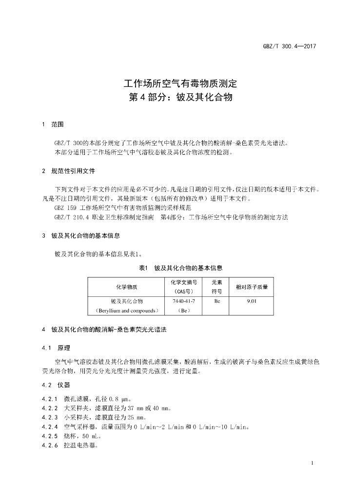 GBZ/T 300.4-2017 工作场所空气有毒物质测定 第4部分:铍及其化合物