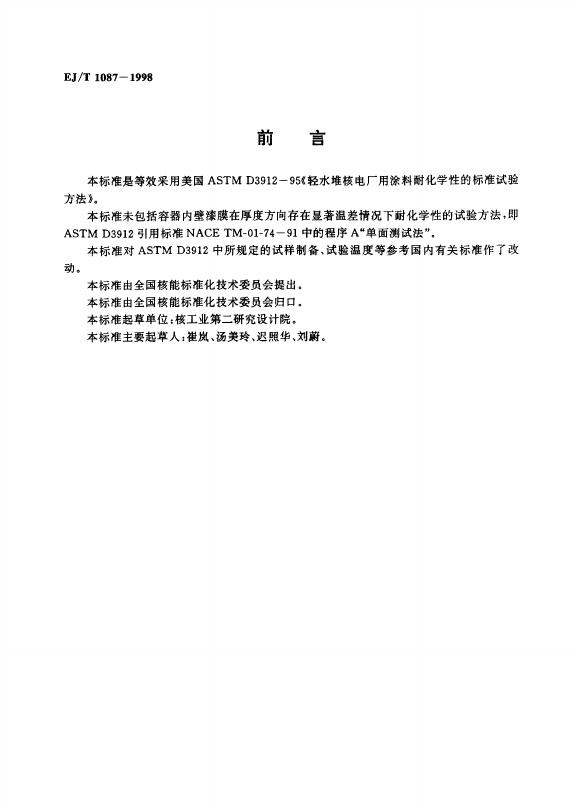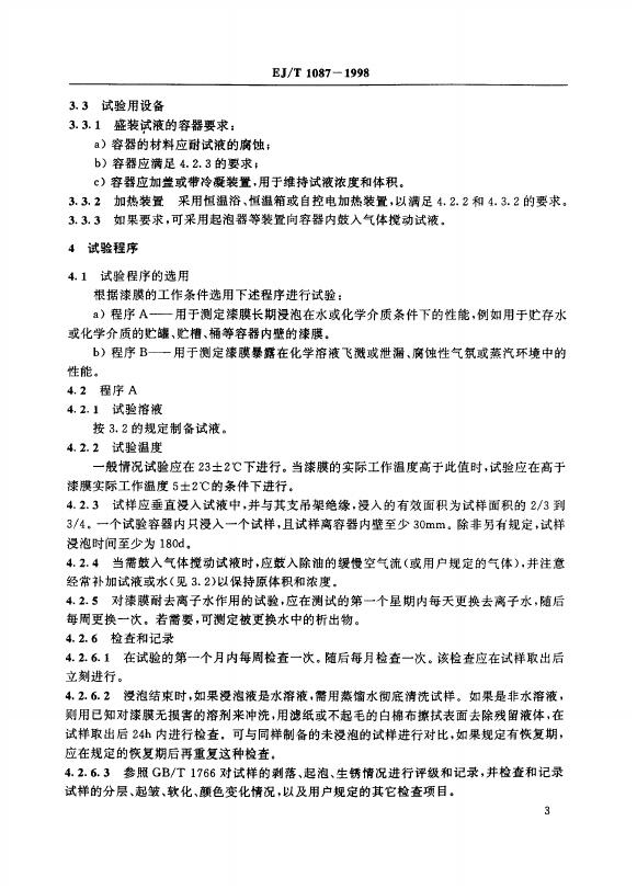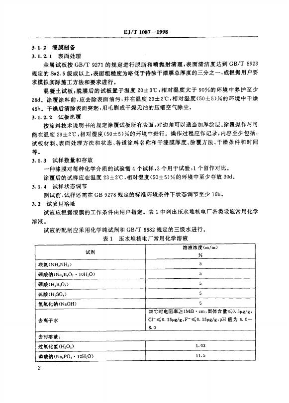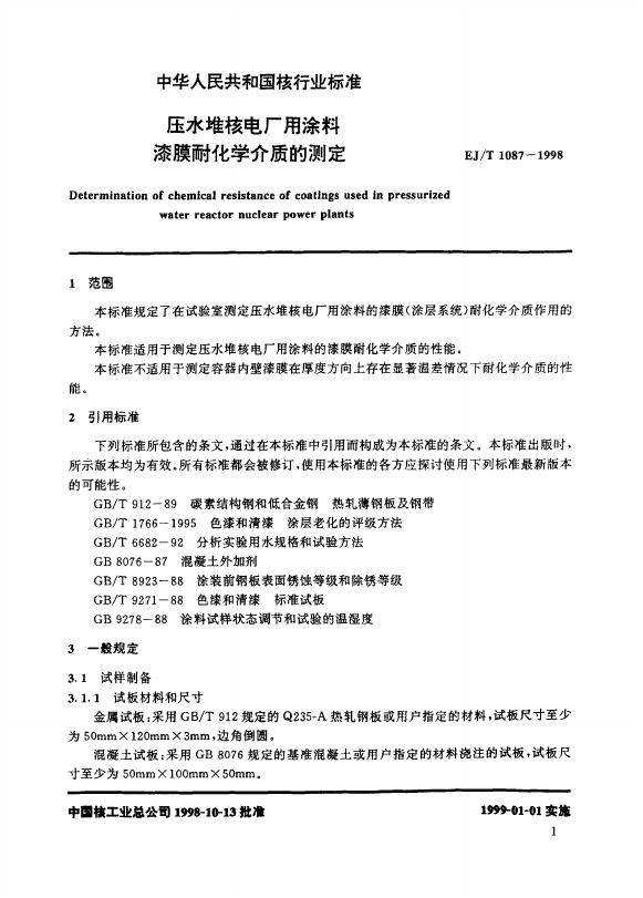EJ/T 1087-1998 压水堆核电厂用涂料 漆膜耐化学介质的测定
