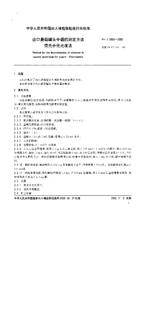 SN/T 0860-2000 出口蘑菇罐头中硒的测定方法 荧光分光光度法
