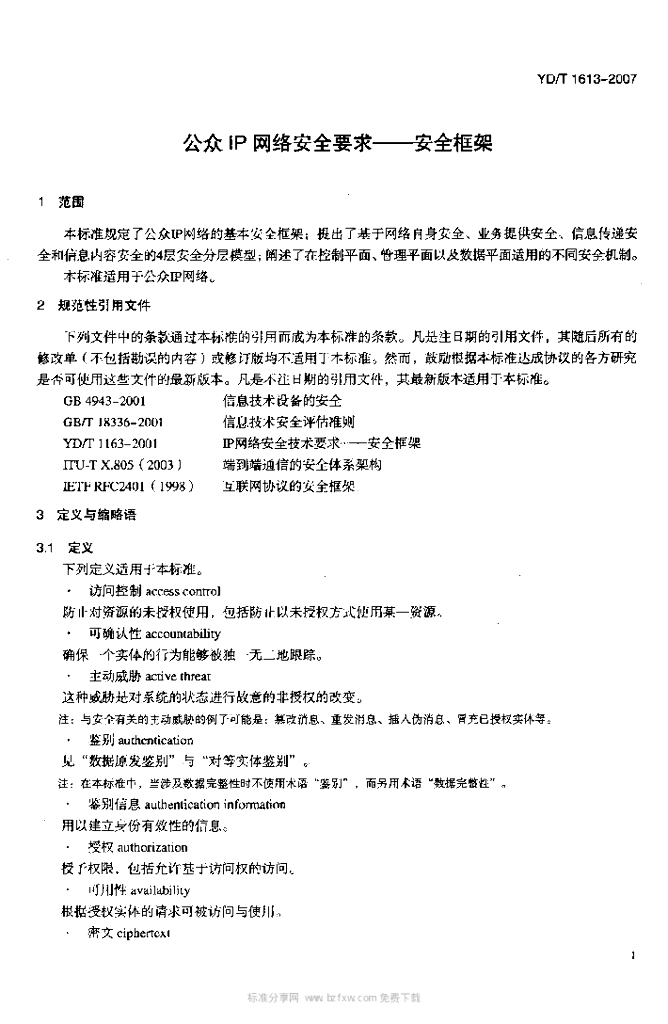 YD/T 1613-2007 公众 IP 网络安全要求安全框架