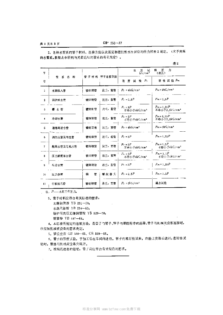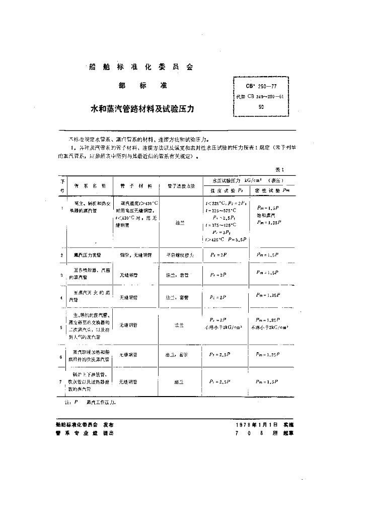 CB 250-1977 水和蒸汽管路材料及试验压力