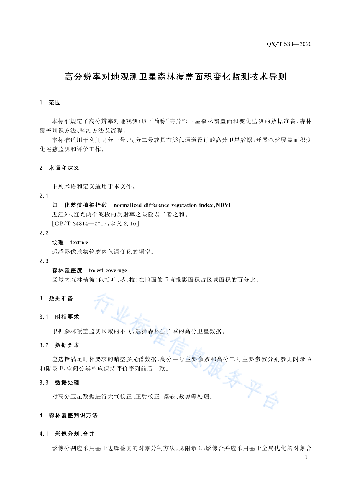 QX/T 538-2020 高分辨率对地观测卫星森林覆盖面积变化监测技术导则