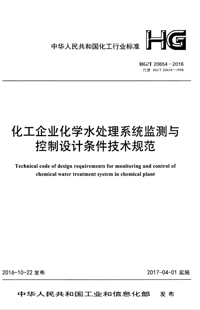 HG/T 20654-2016 代替 HG/T 20654-1998 化工企业化学水处理系统监测与控制设计条件技术规范