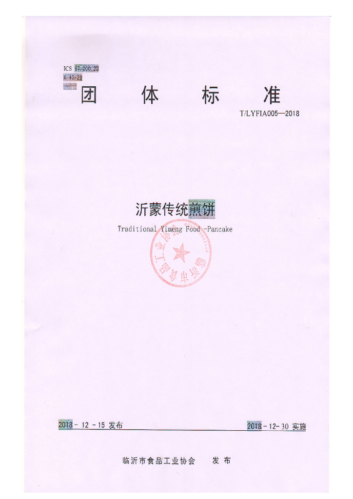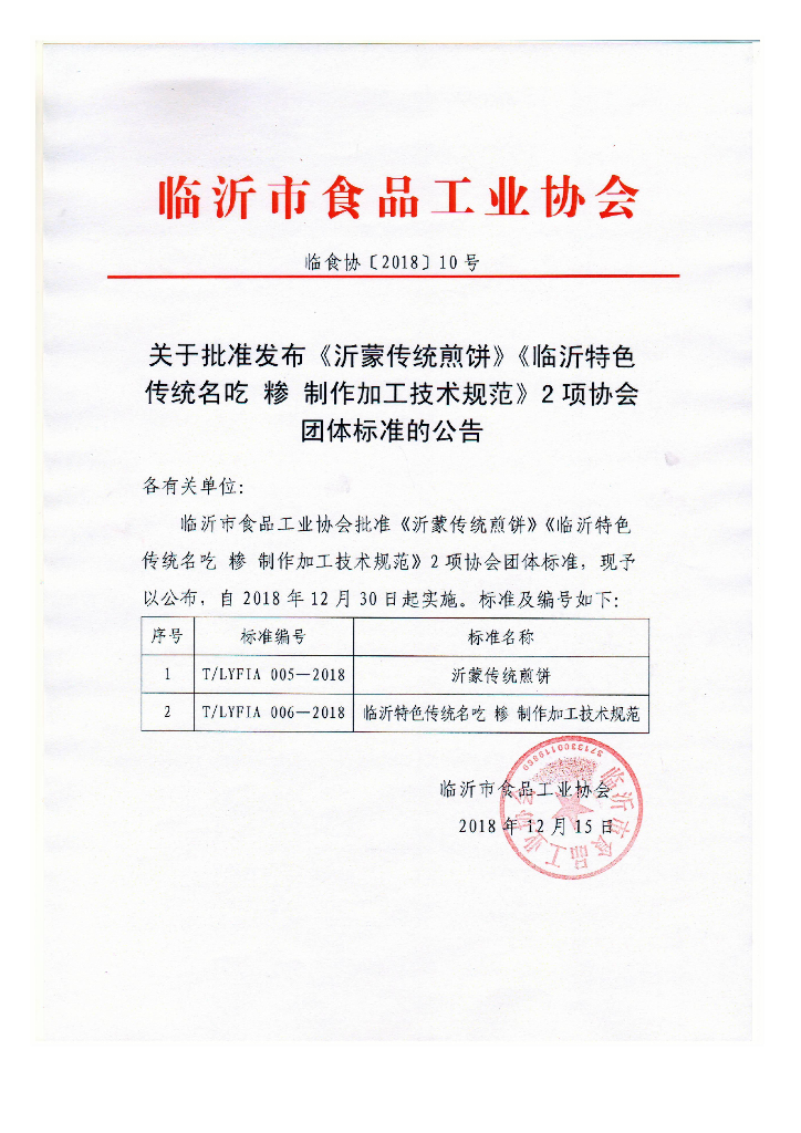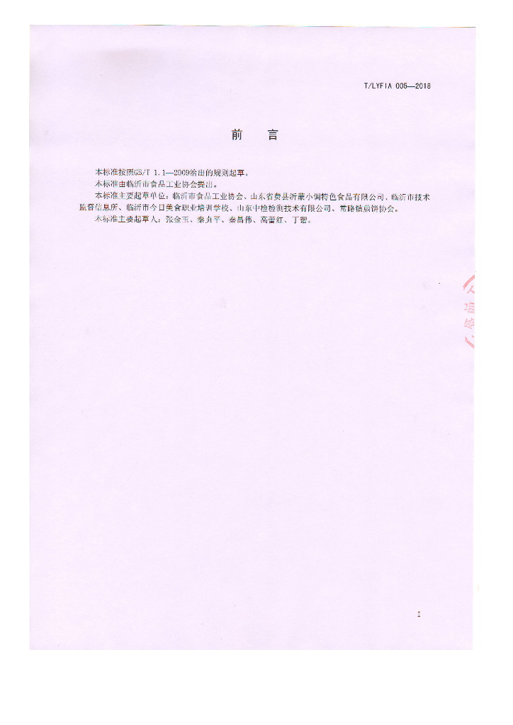 临沂市食品工业协会、山东省费县沂蒙小调特色食品有限公司、临沂市技术 监督信息所、临沂市今日美食职业培训学校、山东中检检测技术有限公司、常路镇煎饼协会。