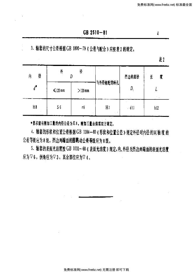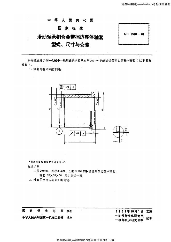 GB/T 2510-1981 滑动轴承铜合金带挡边整体轴套形式、尺寸与公差