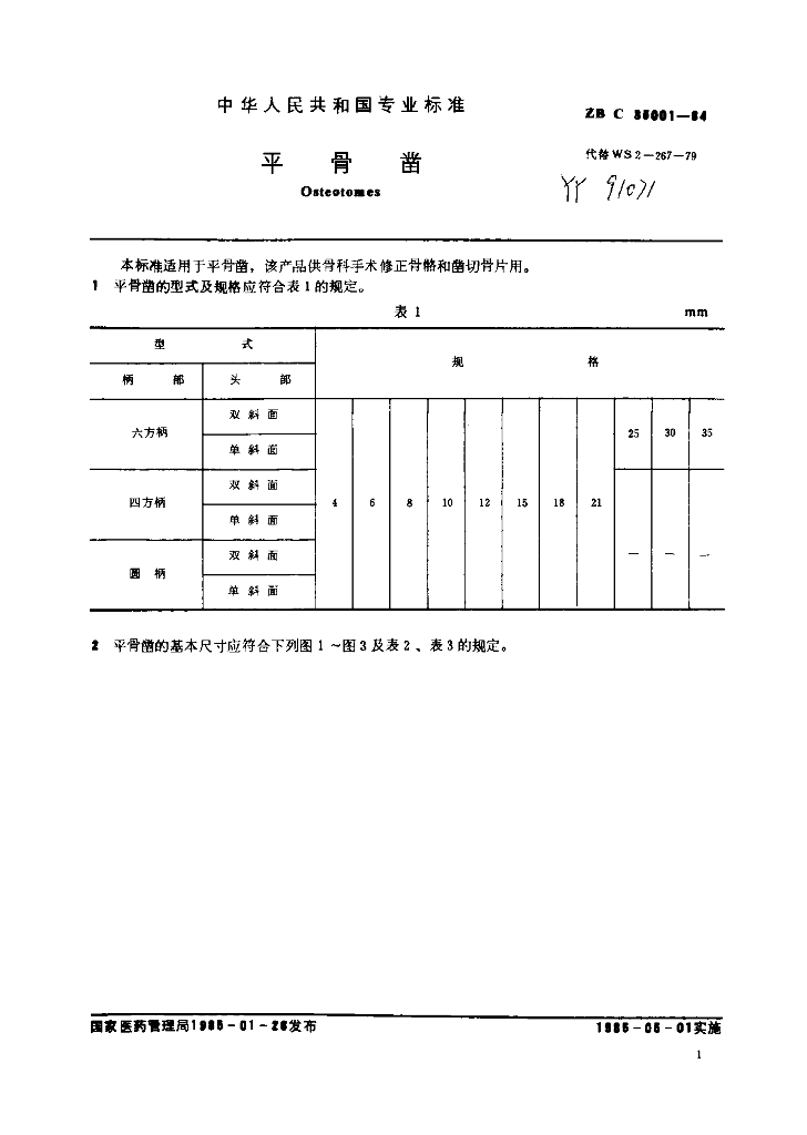 YY 91071-91073-1999 平骨凿圆骨凿 医用凿凿切性能测试方法 平凿、圆凿