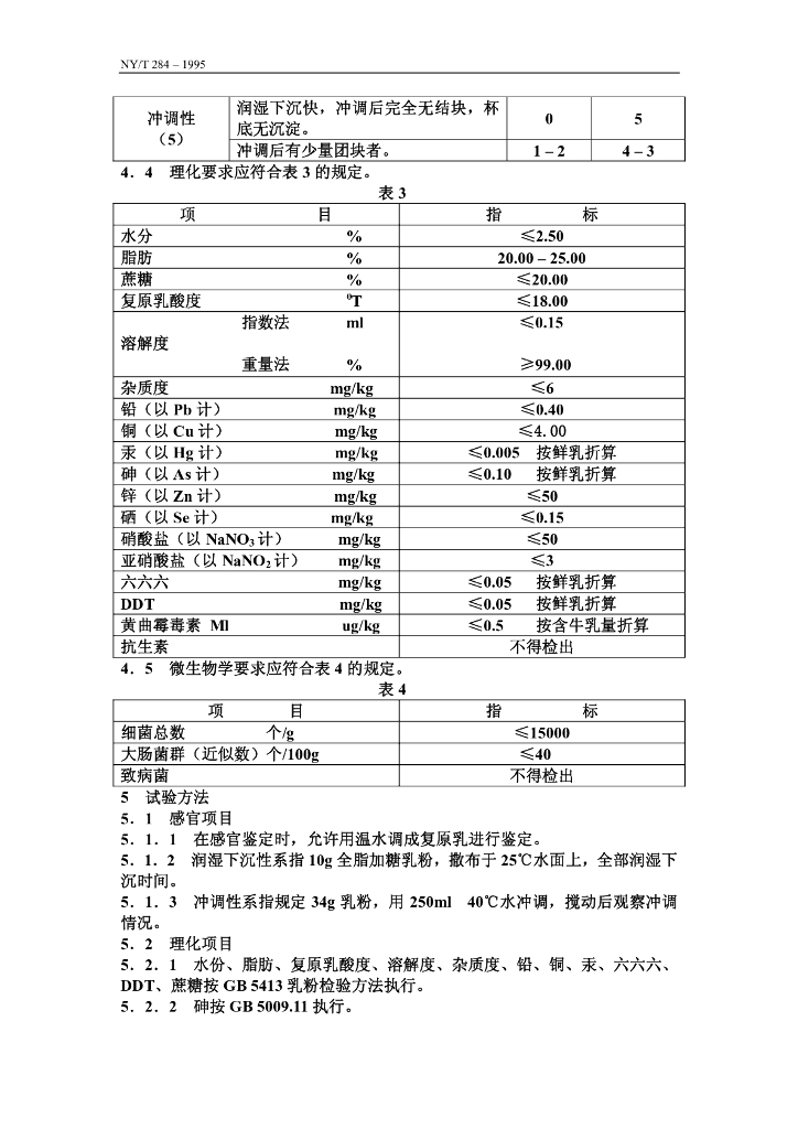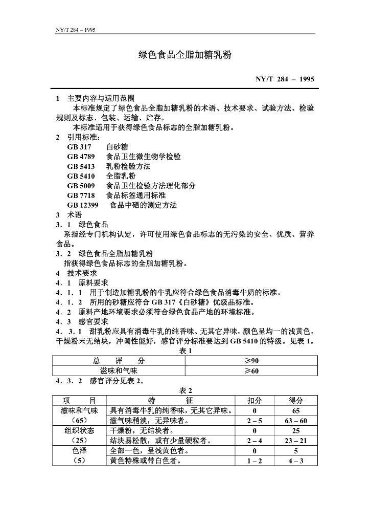 NY/T 284-1995 绿色食品 全脂加糖乳粉