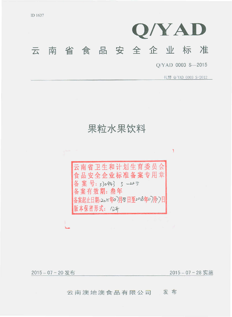 Q/YAD 0003S-2015 云南澳地澳食品有限公司 果粒水果饮料