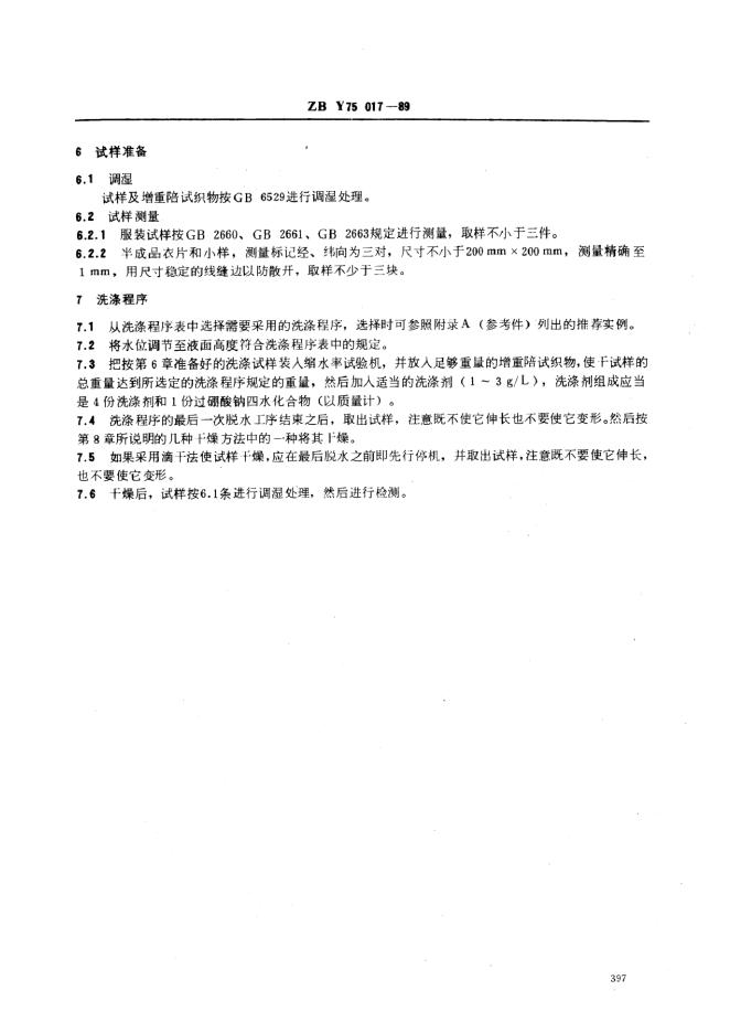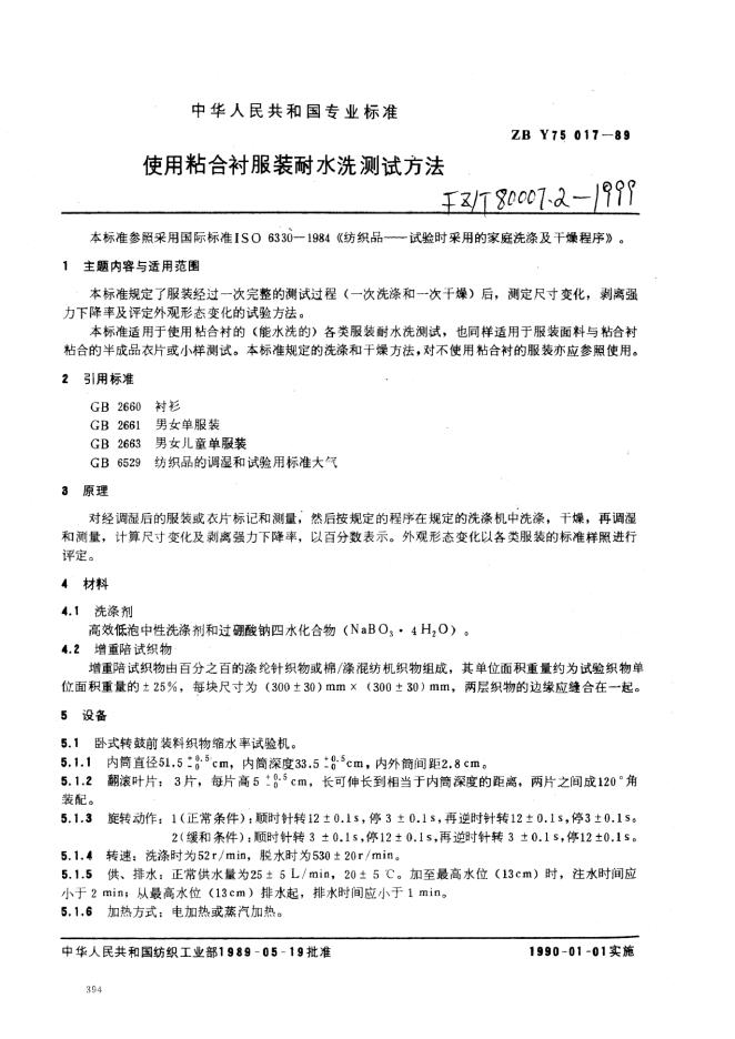 ZBY 75017-1989 使用粘合衬服装耐水洗测试方法