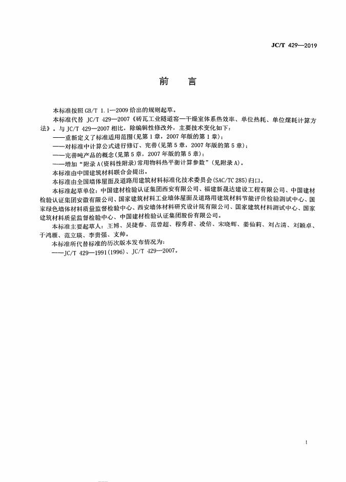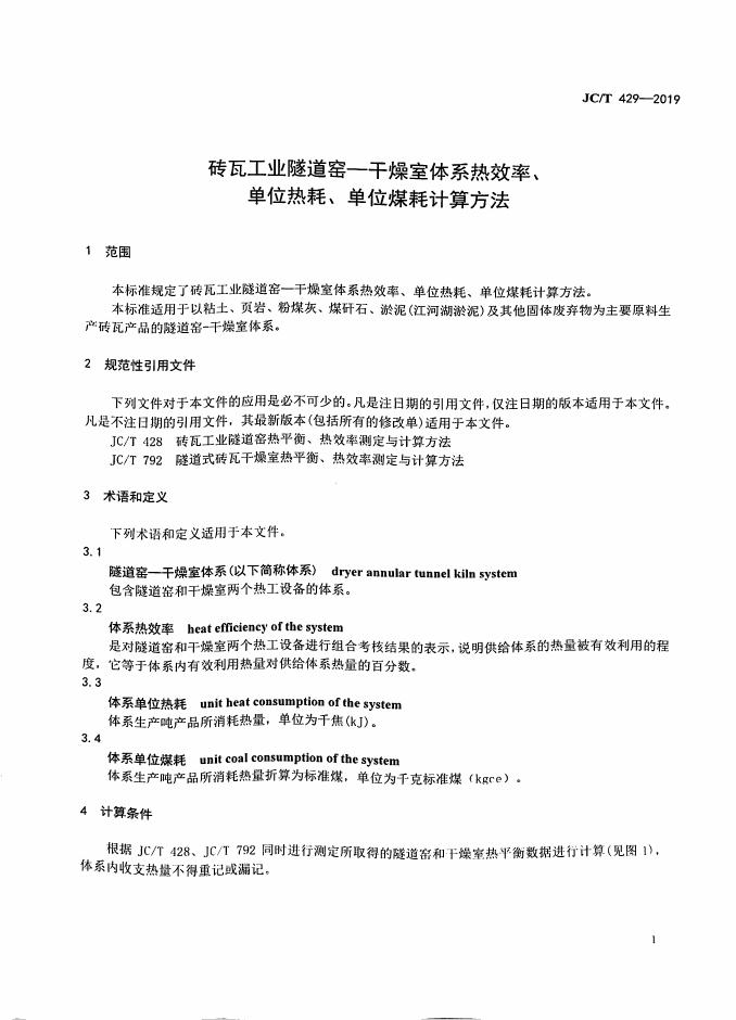 JC/T 429-2019 砖瓦工业隧道窑—干燥室体系热效率、单位热耗、单位煤耗计算方法