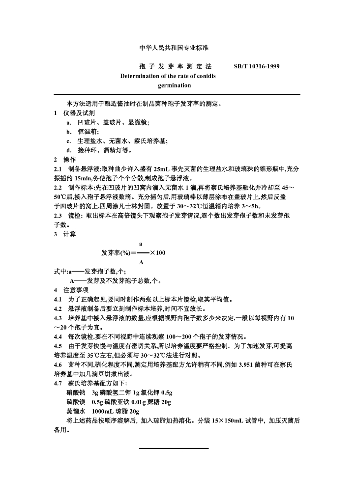 SB/T 10316-1999 孢子发芽率测定法