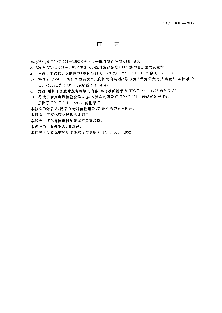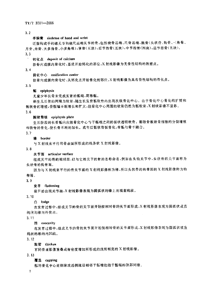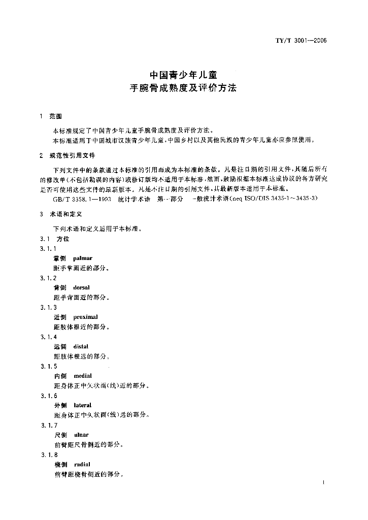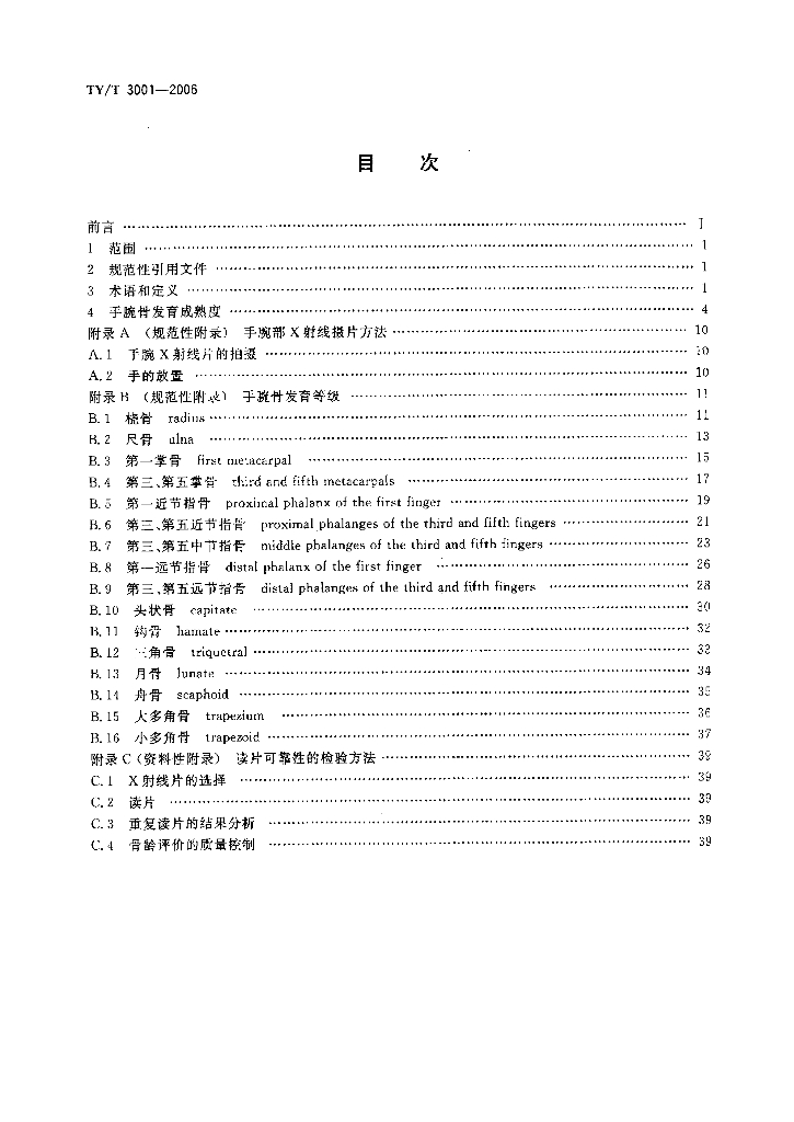 TY/T 3001-2006 中国青少年儿童手腕骨成熟度及评价方法