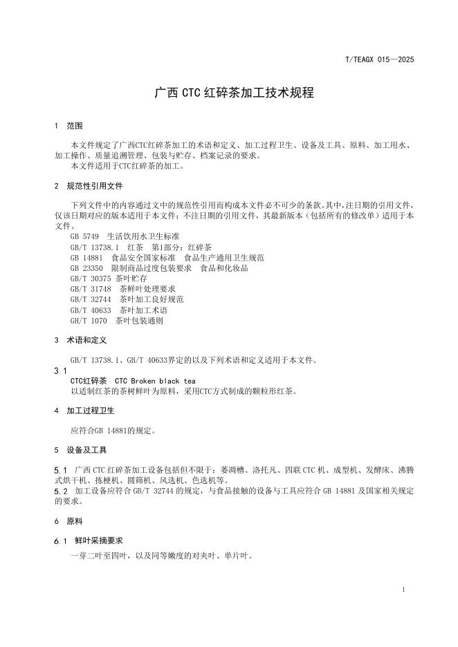 T/TEAGX 015-2025 广西 CTC 红碎茶加工技术规程