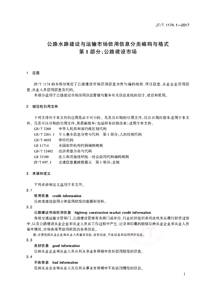 JT/T 1174.1-2017 公路水路建设与运输市场信用信息分类编码与格式 第1部分:公路建设市场