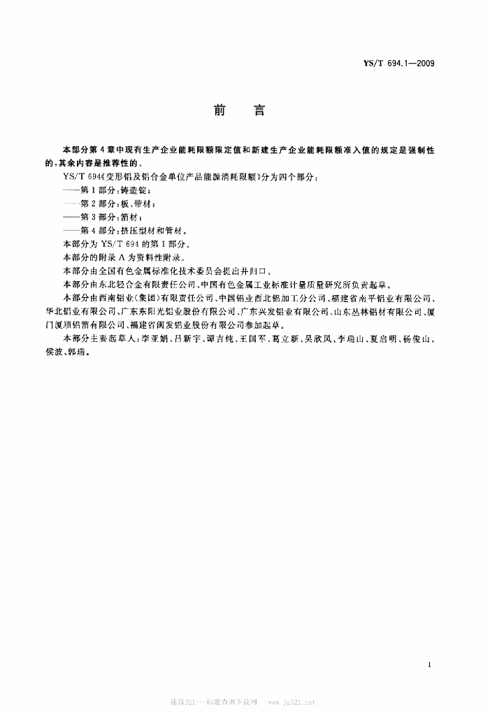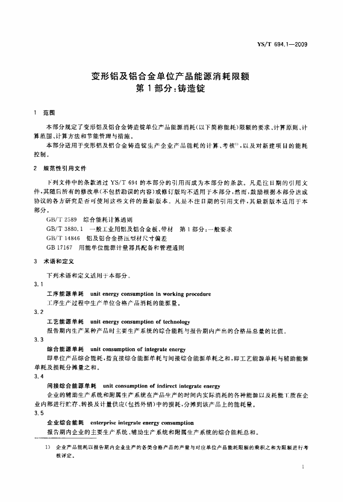 YS/T 694.1-2009 变形铝及铝合金单位产品能源消耗限额 第1部分:铸造锭