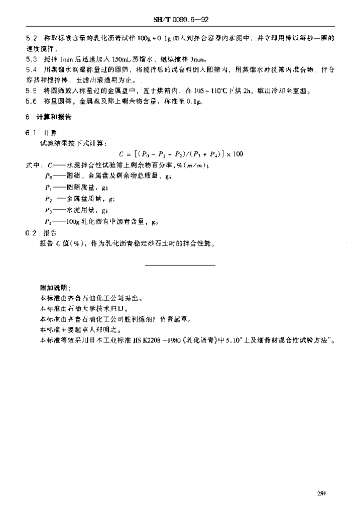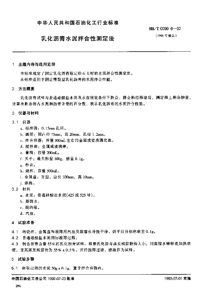 SH/T 0099.6-1991 乳化沥青水泥拌合性测定法