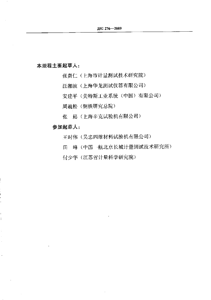 张贵仁(上海市计量测试技术研究院)、汪湘波(上海华龙测试仪器有限公司)、安建平(美特斯工业系统(中国)有限公司)、周巍松(钢铁研究总院)、张裕(上海辛克试验机有限公司)、王时伟(吴忠四维材料试验机有限公司)、田峰(中国一航北京长城计量测试技术研究所)、付少华(江苏省计量科学研究院)