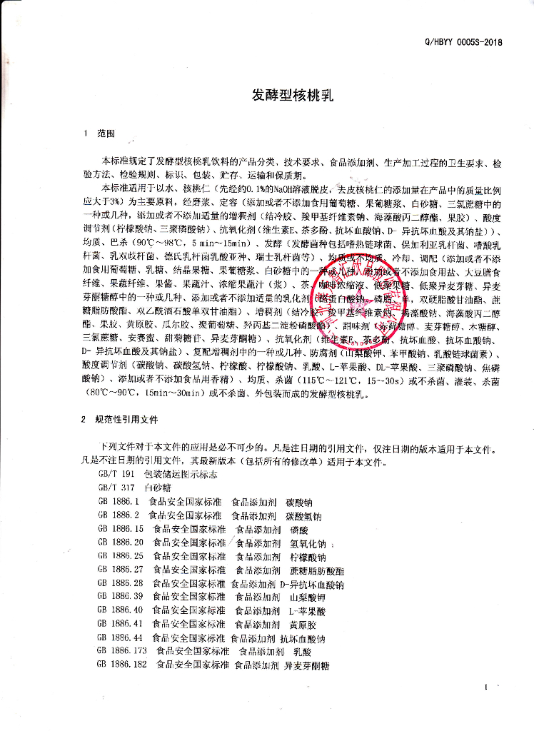 Q/HBYY 0005S-2018 发酵型核桃乳