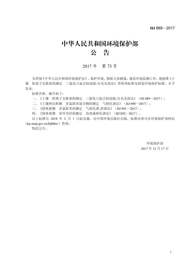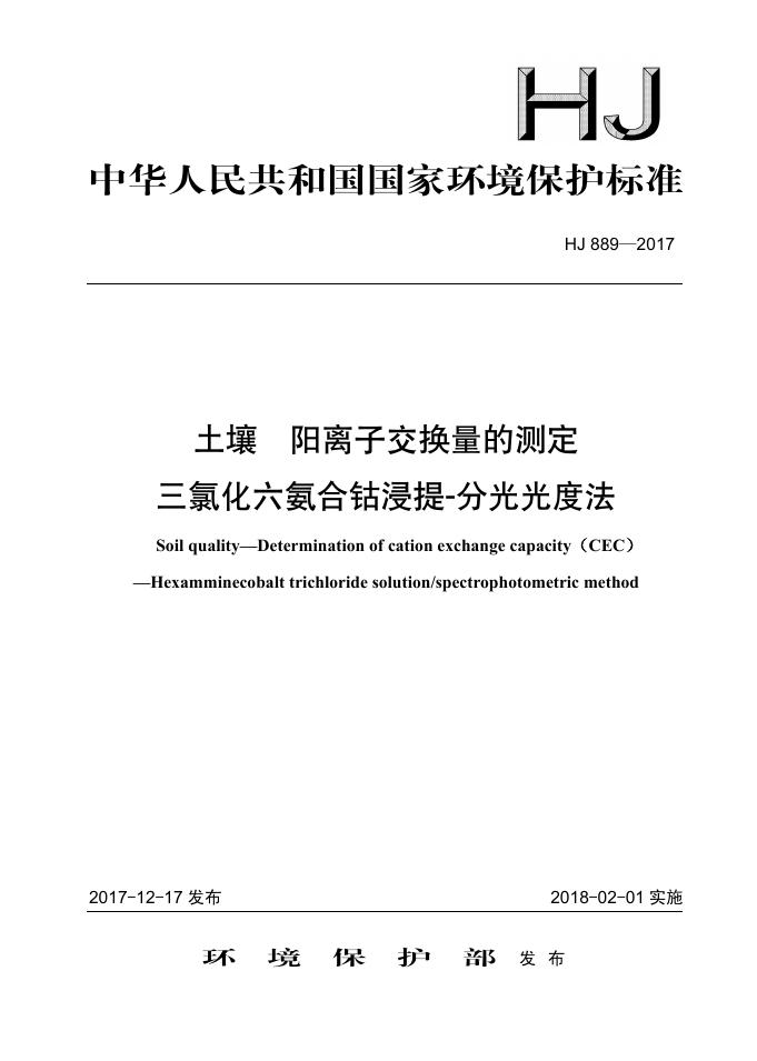 HJ 889-2017 土壤 阳离子交换量的测定 三氯化六氨合钴浸提-分光光度法
