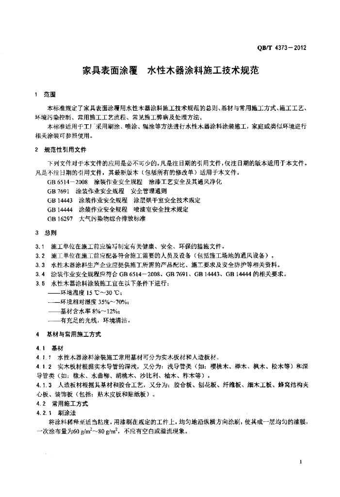 QB/T 4373-2012 家具表面涂覆水性木器涂料施工技术规范