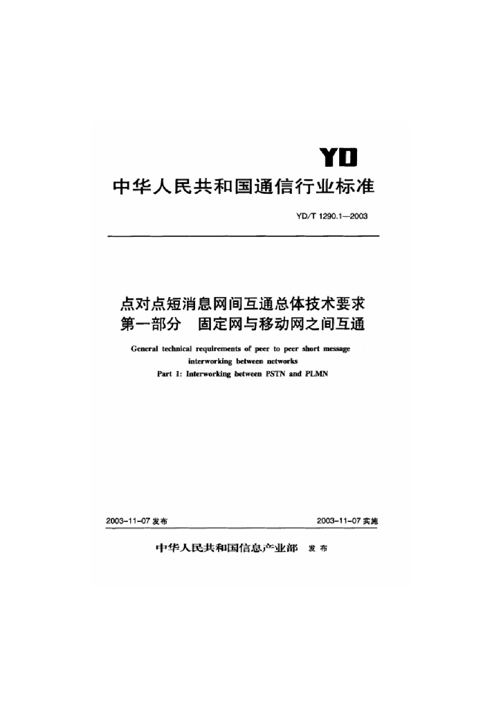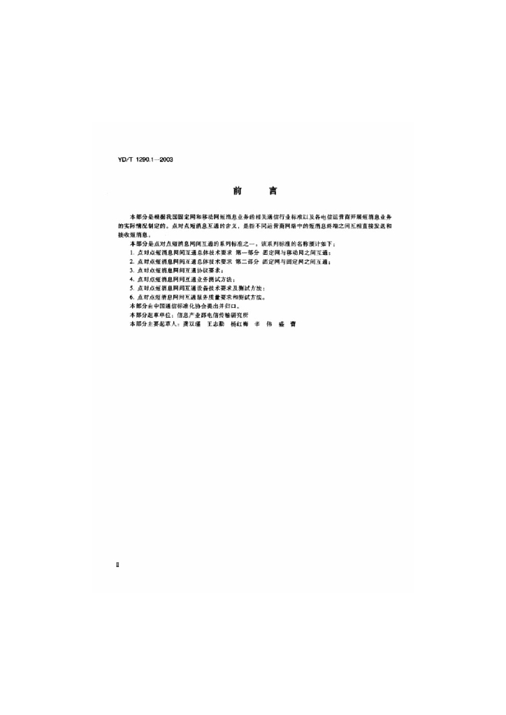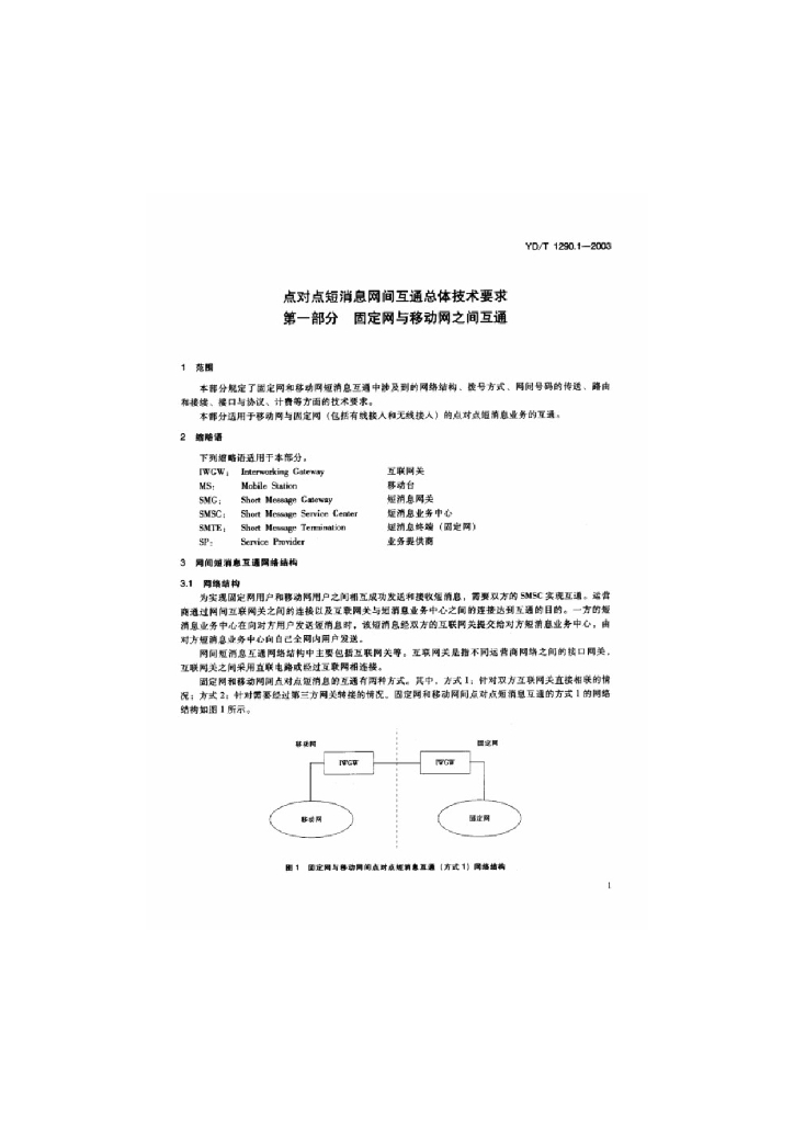 YD/T 1290.1-2003 点对点短消息网间互通总体技术要求 第一部分:固定网与移动网之间互通