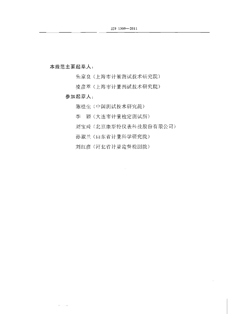 朱家良(上海市计量测试技术研究院)、凌彦萃(上海市计量测试技术研究院)、陈桂生(中国测试技术研究院)、李颖(大连市计量检定测试所)、刘宝琦(北京康斯特仪表科技股份有限公司)、孙淑兰(山东省计量科学研究院)、刘红彦(河北省计量监督检测院)