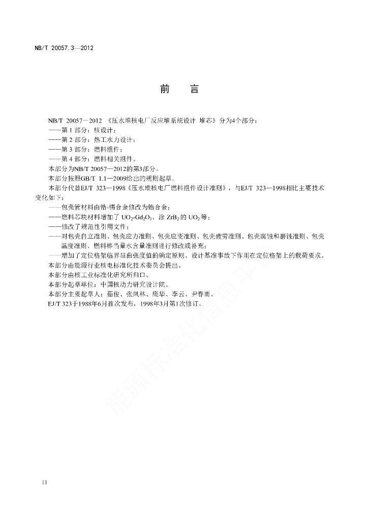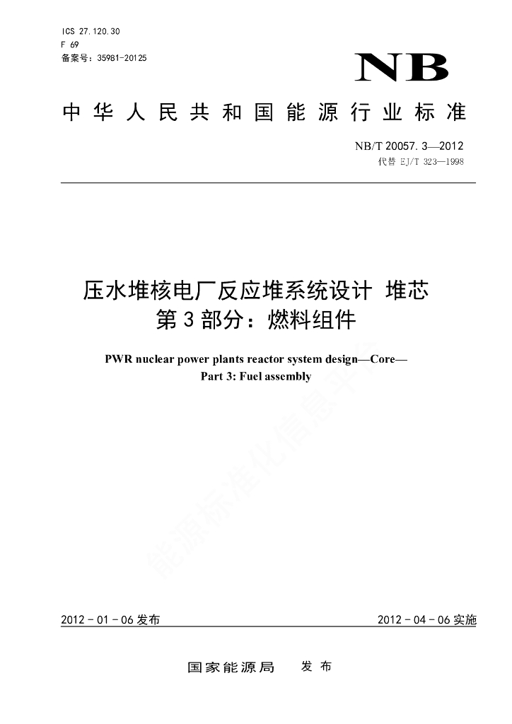 NB/T 20057.3-2012 压水堆核电厂反应堆系统设计 堆芯 第3部分:燃料组件