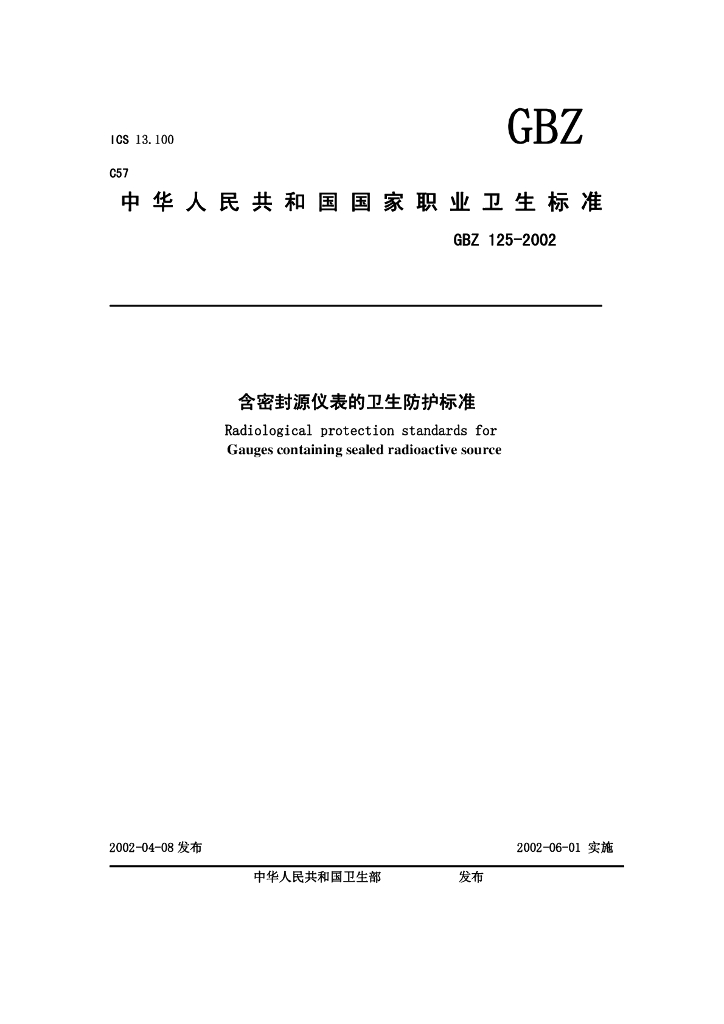 GBZ 125-2002 含密封源仪表的卫生防护标准