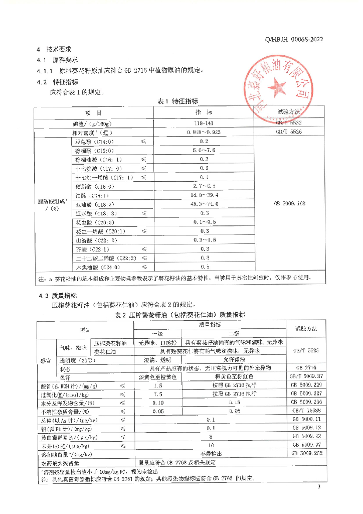 Q/HBJH 0006S-2022 葵花籽油