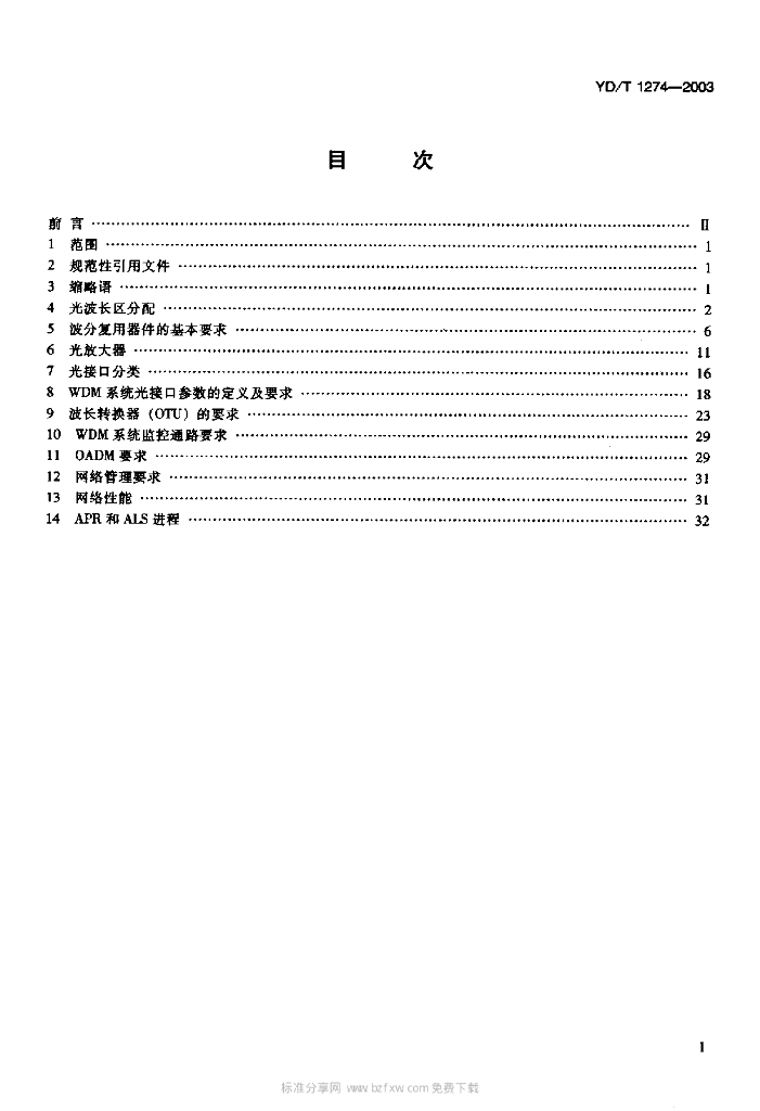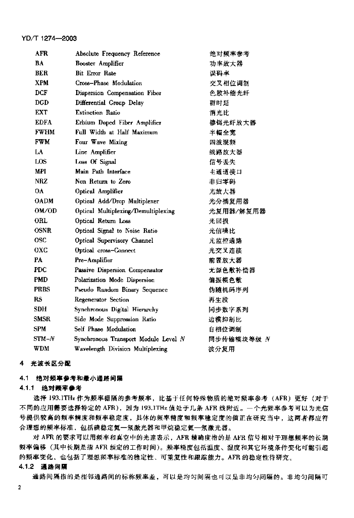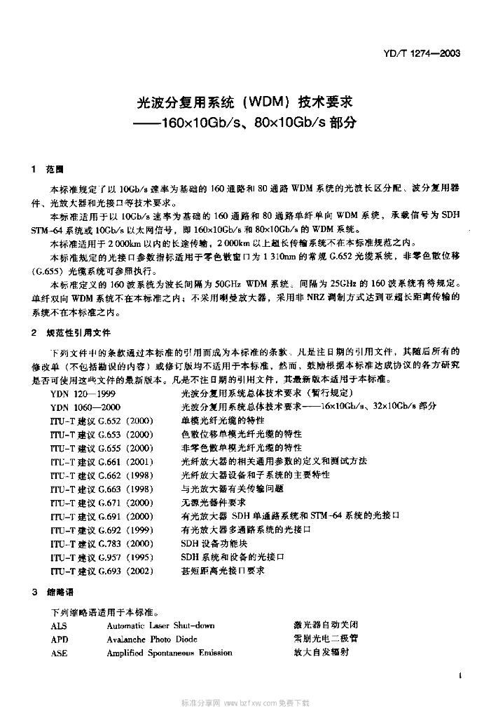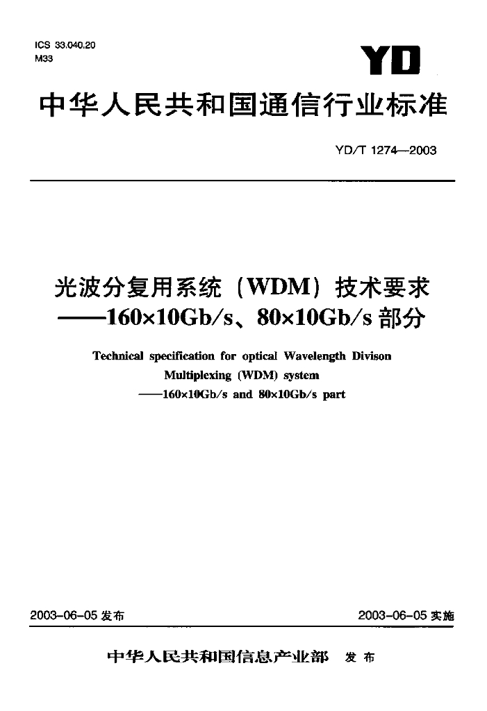 YD/T 1274-2003 光波分复用系统(WDM)技术要求——160x10Gb/s、80x10Gb/s部分