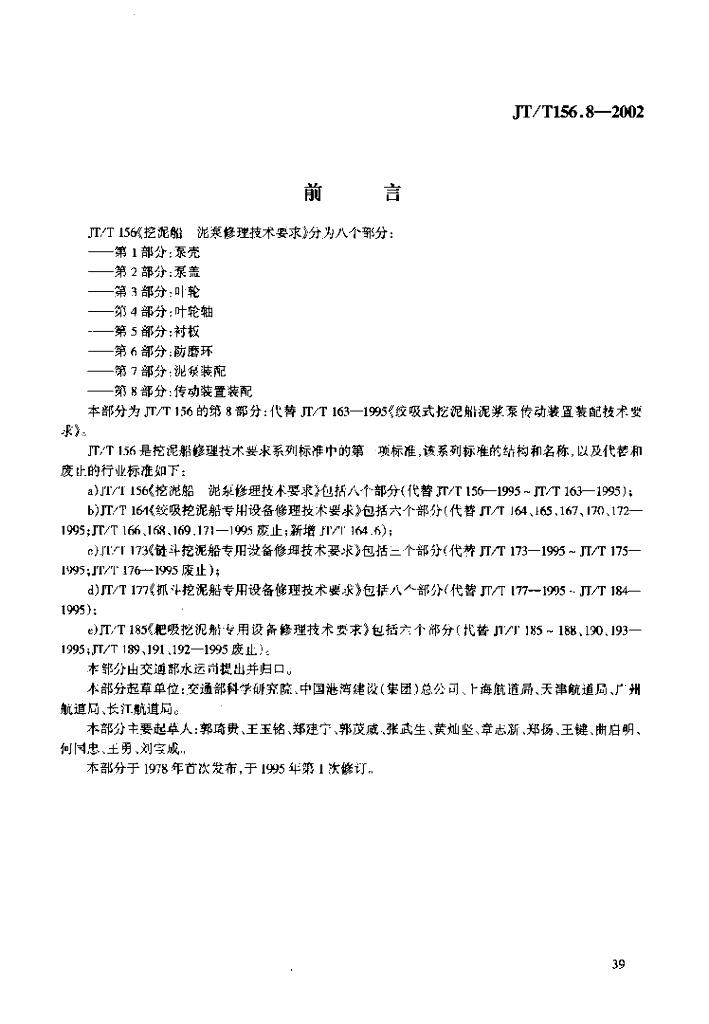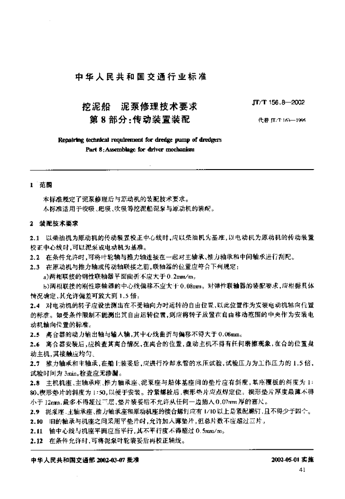 JT/T 156.8-2002 挖泥船泥 泵修理技术要求 第8部分:传动装置装配