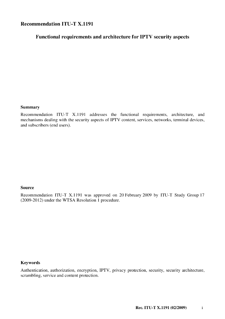 ITU-T X.1191-2009 IPTV安全方面的功能要求和架构