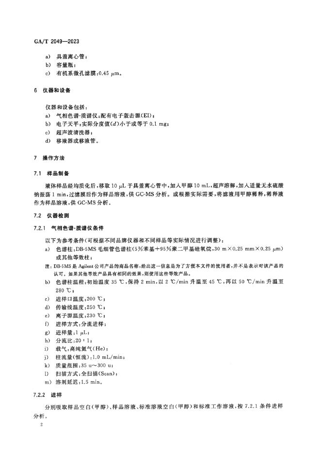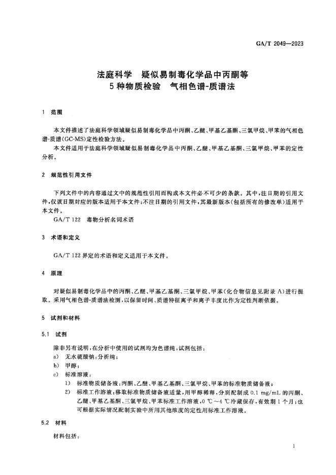GA/T 2049-2023 法庭科学 疑似易制毒化学品中丙酮等5种物质检验气相色谱-质谱法